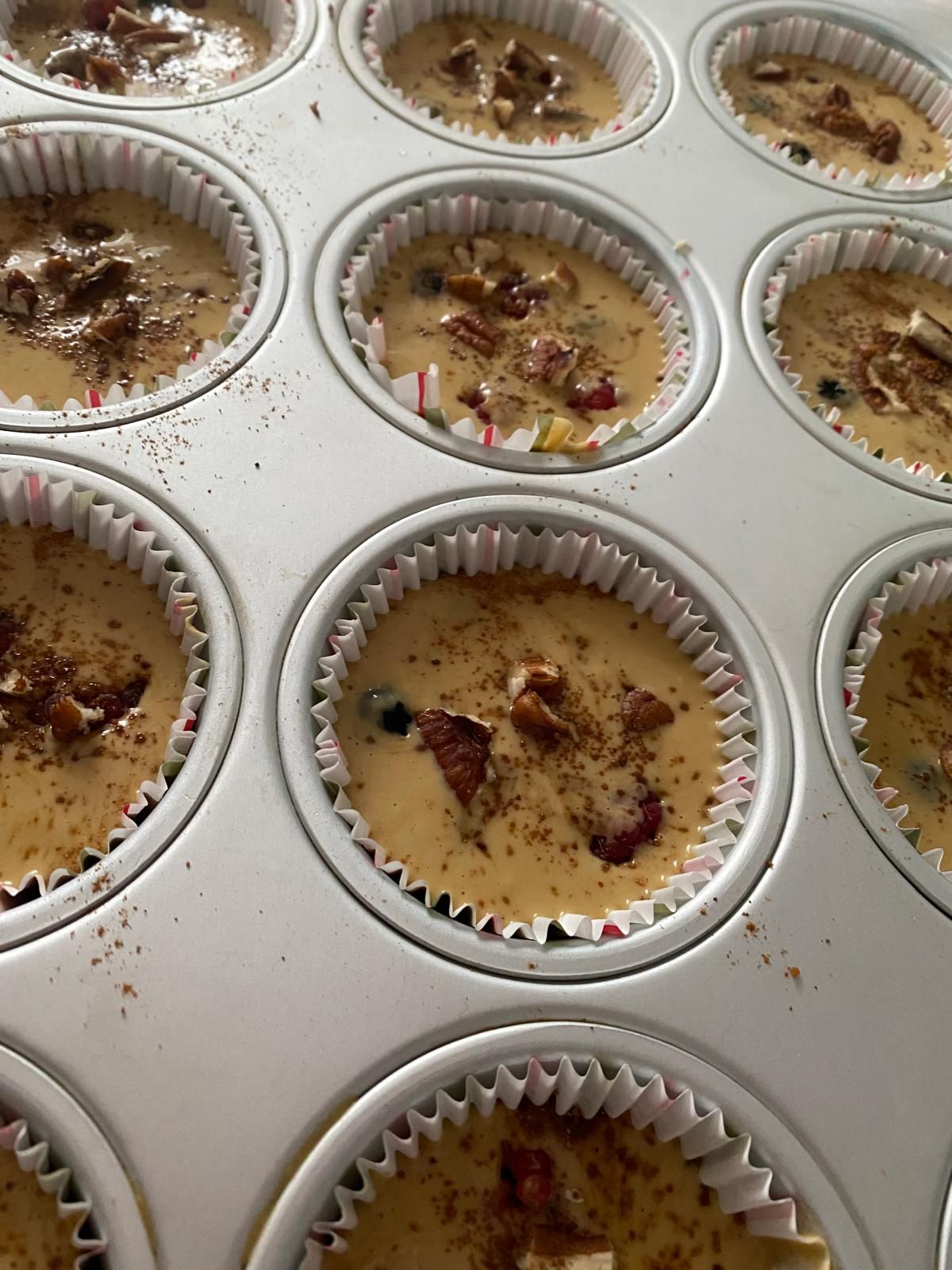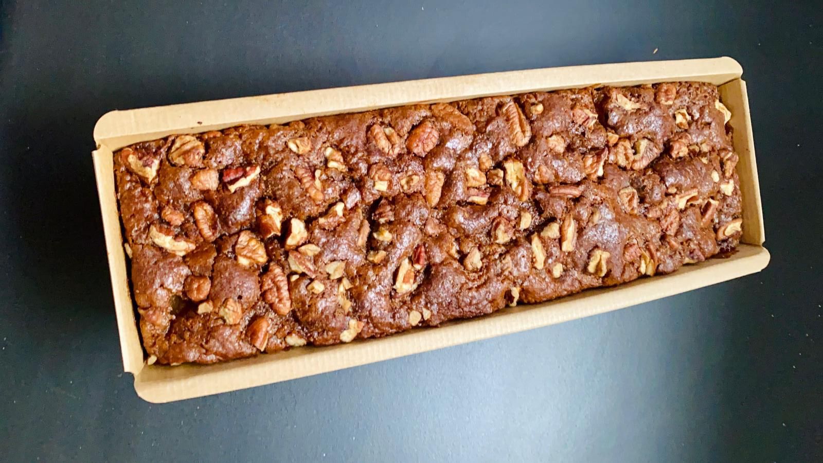 6. מעבירים לתבנית; מפזרים מעל קינמון, מעט סוכר קוקוס ואגוזי פקאן.