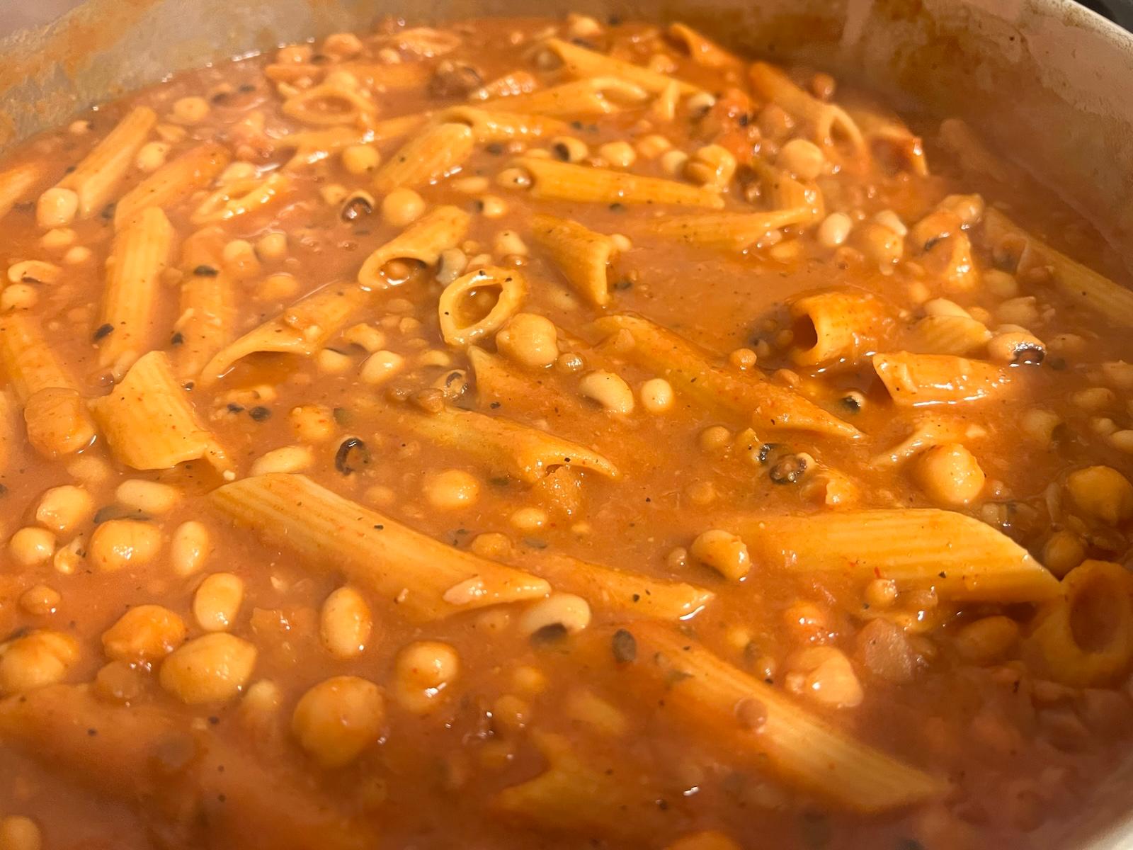 במקביל, בסיר גדול מטגנים בצל קצוץ עד להזהבה עמוקה. מוסיפים רסק עגבניות, מערבבים היטב, ומתבלים בפפריקה, פלפל שחור, מלח ומעט אבקת מרק בטעם ירקות או עוף. מוסיפים מים רותחים עד כחצי גובה הסיר ומביאים לרתיחה. כשהתבשיל מבעבע, מוסיפים את המקרונים (או פתיתים אפויים, למי שמעדיף), ומבשלים מספר דקות עד לריכוך. בשלב הזה מצרפים את הקטניות המבושלות, מערבבים היטב ונותנים לכל הטעמים להתאחד. חשוב לערבב מדי פעם, לטעום ולדייק תיבול לפי הצורך.