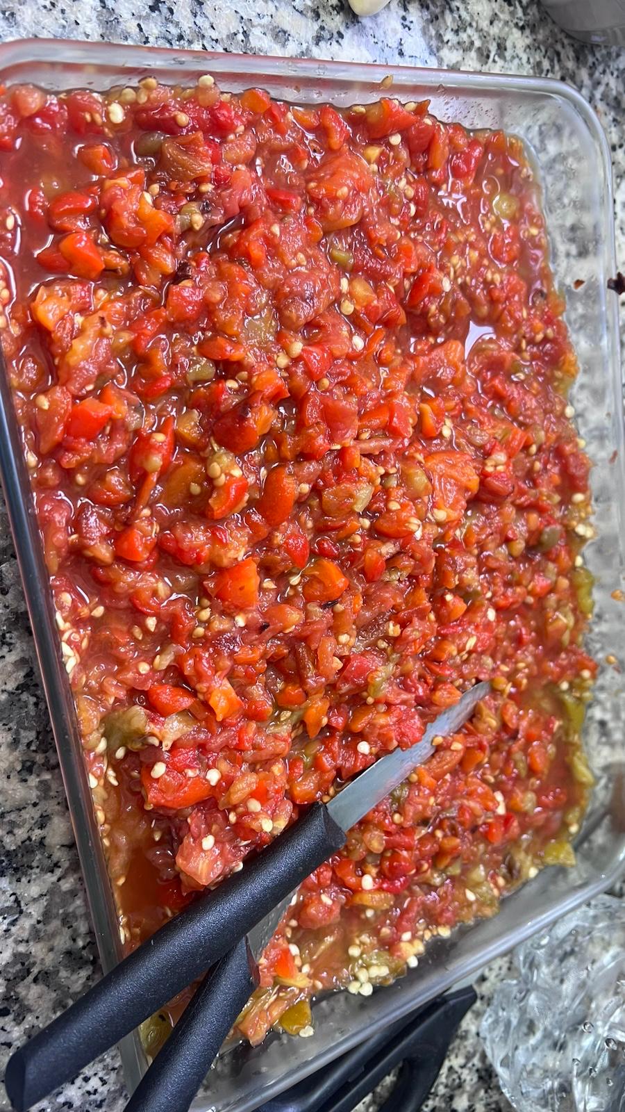 כדי להשלים את החוויה, אי אפשר בלי הסלטה משוואיה, סלט קלוי שמביא איתו עומק, חריפות ורעננות שמשדרגת את כל התבשיל. את הסלטה מכינים מפלפלים מתוקים, פלפלים חריפים ועגבניות. קולים אותם על אש גלויה, או בתנור או על מחבת פסים, עד שהקליפה שרופה היטב ומתרככת. לאחר מכן מניחים להם להתקרר מעט, מקלפים את הקליפה השרופה וקוצצים בינוני. אני קוצצת בשיטה מיוחדת שלימדה אותי אימי מרסל ליאון ז"ל באמצעות שני סכינים שלובים.