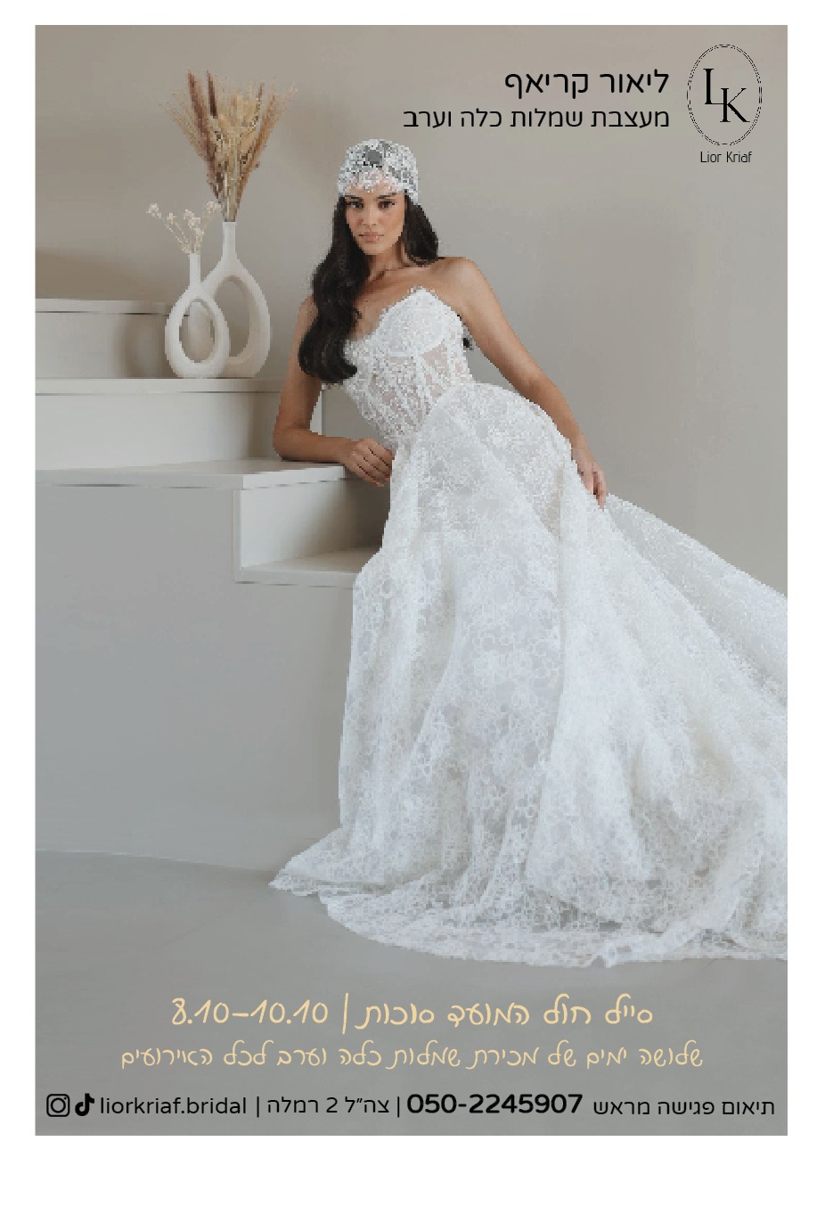נתחיל עם חדשות נוצצות במיוחד – ליאור קריאף, המעצבת מרמלה שמגשימה חלומות לכלות ונשים באירועים, יוצאת במבצע ענק בחול המועד סוכות! בין התאריכים 8–10.10 תתקיים מכירת ענק של שמלות כלה וערב – לוק ראשון לחופה, לוק שני מיני/מקסי, נפוח, צמוד, סאטן, תחרה, לחינה, להפרשת חלה – בקיצור כל מה שכלה או חוגגת צריכה.