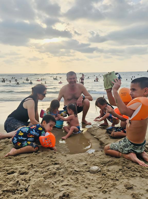 אירית ומיכאל וידל עם הנכדים בחוף הים