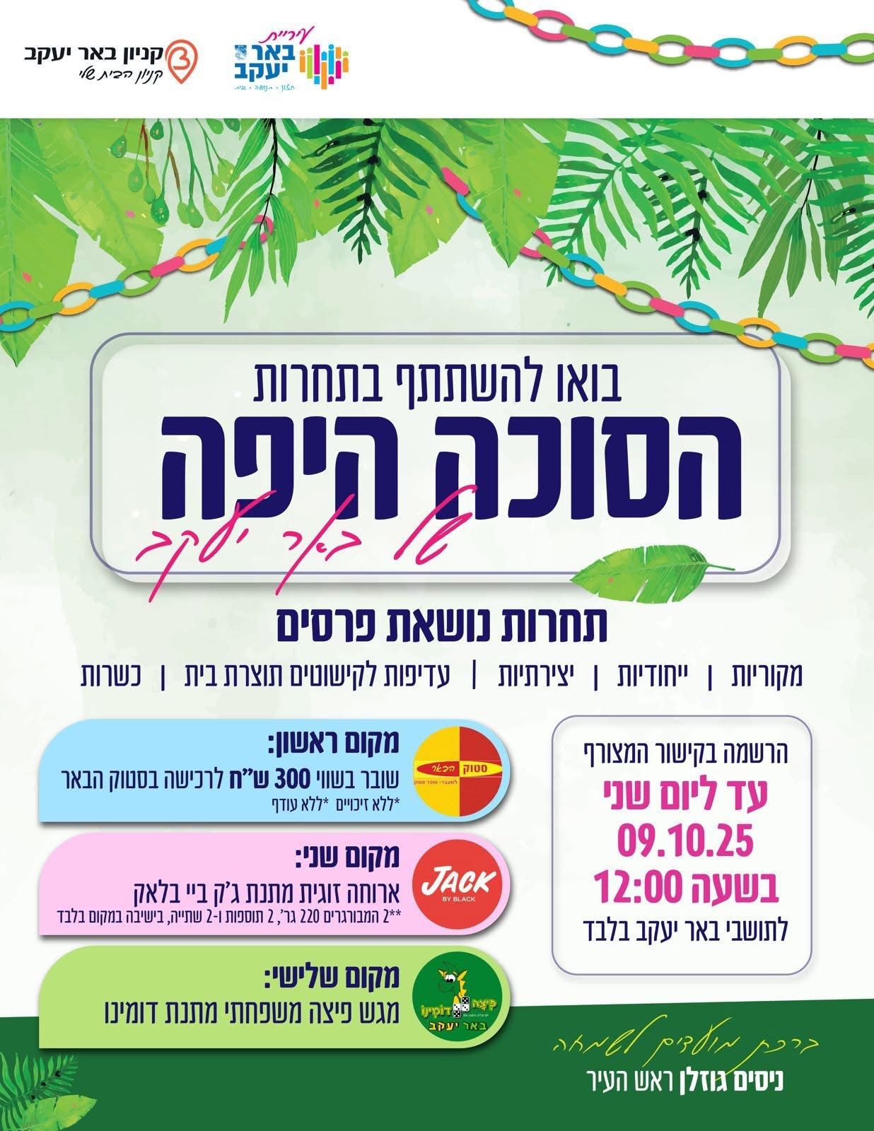 עיריית באר יעקב ממשיכה במסורת האהובה של חג הסוכות ומזמינה את תושבי העיר להשתתף בתחרות “הסוכה היפה”.