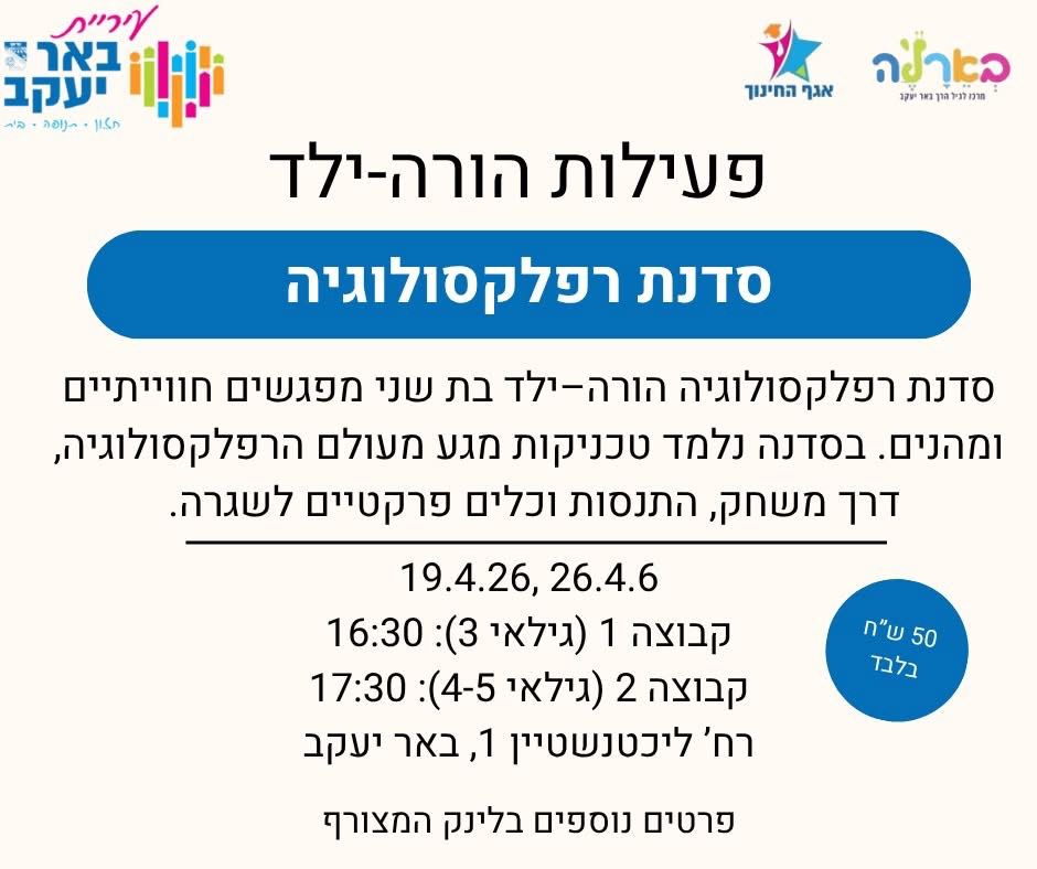 הסדנה תתקיים בתאריכים 19.4.26 ו-26.4.26, ותכלול שתי קבוצות גיל: קבוצה ראשונה לילדים בגילאי לידה עד 3 בשעה 16:30, וקבוצה שנייה לילדים בגילאי 4–5 בשעה 17:30. המפגשים ייערכו ברחוב ליכטנשטיין 1 בבאר יעקב. עלות ההשתתפות עומדת על 50 ש"ח בלבד, וההשתתפות מותנית ברישום מראש. מספר המקומות מוגבל.