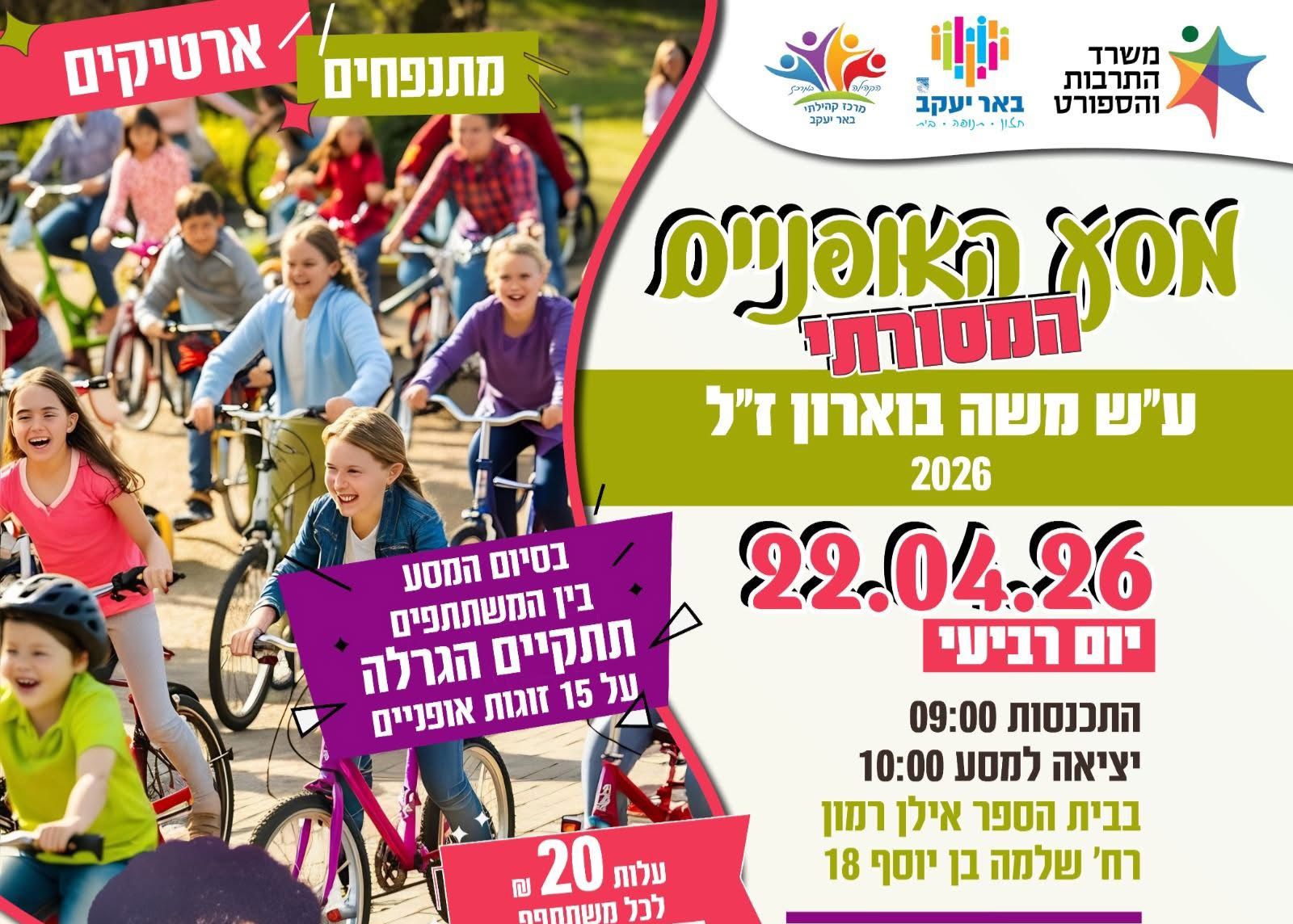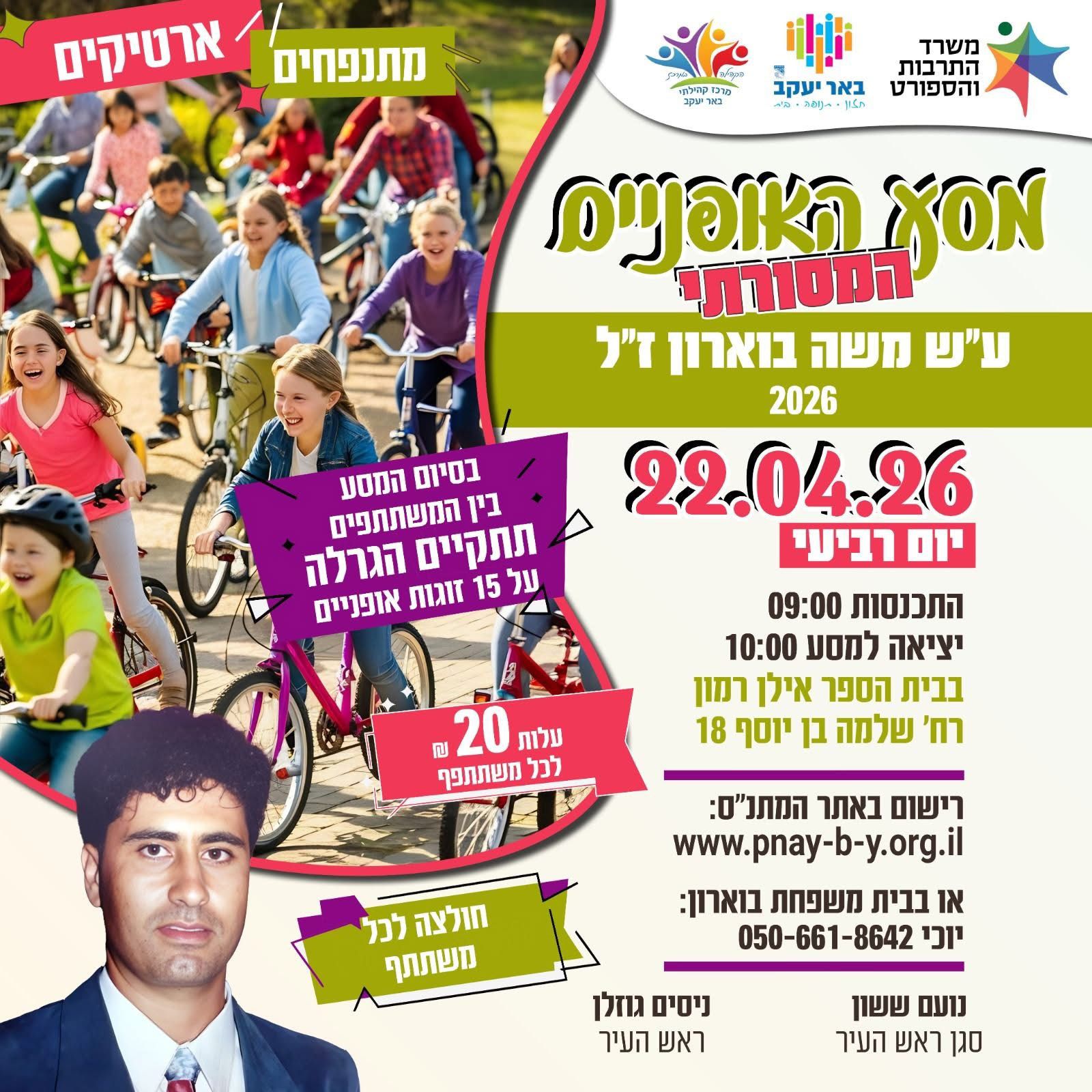 “כפי שפרסמתי, גם השנה נקיים את מסע האופניים המסורתי של באר יעקב לזכרו של משה בוארון ז״ל. אני מזמין את כולכם להצטרף, לקחת חלק בחוויה משותפת של ספורט, קהילה והנצחה, ולצאת יחד למסע שמסמל את הרוח היפה של באר יעקב”.