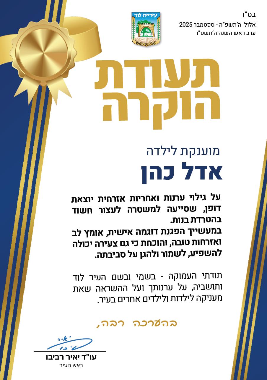 ראש עיריית לוד, עו"ד יאיר רביבו, אירח בשבוע שעבר בלשכתו את אדל כהן - ילדה צעירה ומקסימה ותלמידת כיתה ז' מבי"ס המעפילים בלוד, ואת אמה שירן, והעניק לאדל תעודת הוקרה בשמו ובשם תושבי לוד, כהוקרה על גילוי ערנות יוצאת דופן ואומץ לב אזרחי.