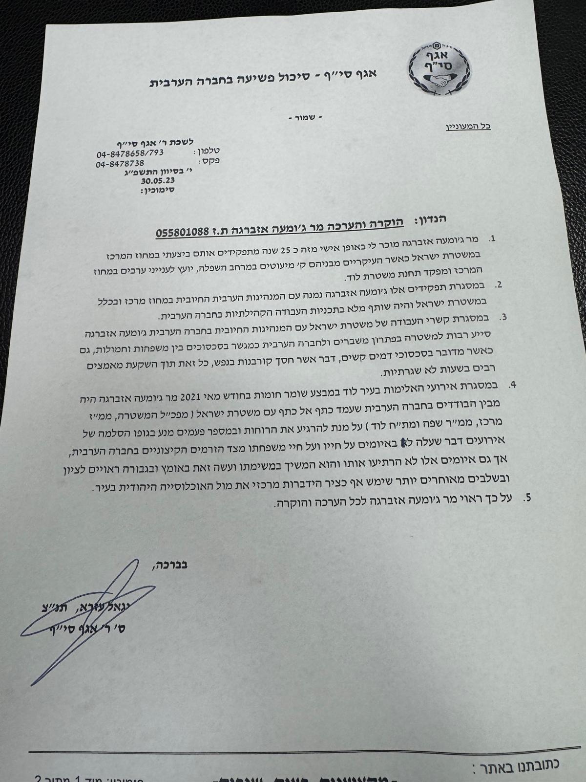 אביו, ג׳ומעה אזברגה – איש ציבור מוערך, ששימש לאורך השנים דמות מגשרת בעיר לוד ואף זכה לשבחים מצד גורמי ביטחון– נפגע עמוקות מהשמועות על בנו. דווקא באותם הימים, בחודש מאי 2021, כשהעיר סערה והרוחות בערו, היה ג׳ומעה מבין הבודדים שעמדו בחזית ההרגעה ופעל ללא לאות להרגיע את השטח. הוא שימש גשר בין הנהגת העיר לבין ראשי ובני המגזר הערבי, מתוך מטרה אחת – למנוע את התלקחותה של העיר כולה, וכהרגלו, עשה זאת בצניעות ובדרכי נועם, כפי שהוא נוהג תמיד.