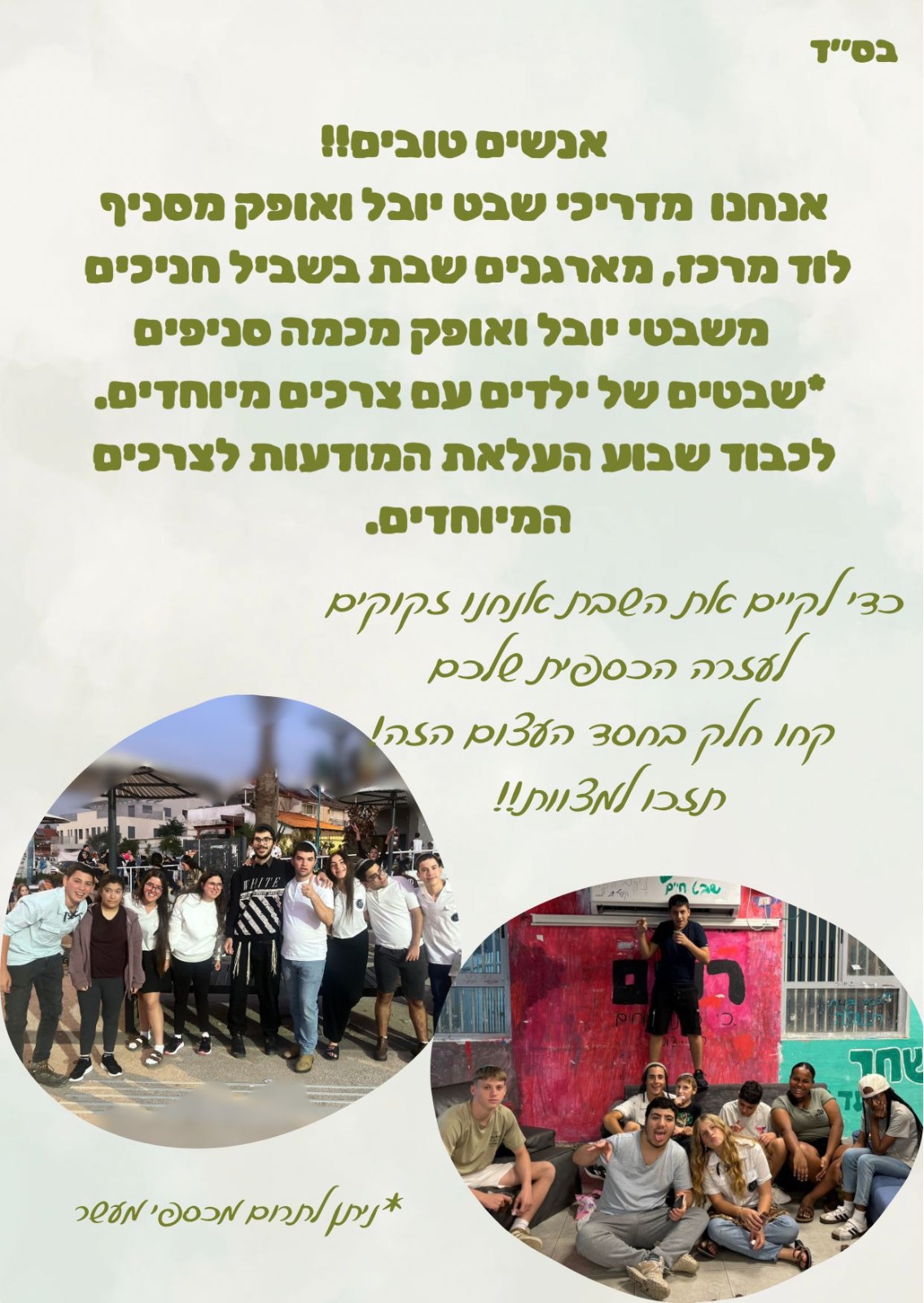 מדריכי שבט יובל ואופק מסניף לוד מרכז מוסרים כי כדי שנוכל לקיים את השבת הזו, אנו זקוקים לעזרת הציבור. כל תרומה קטנה או גדולה – הופכת לרגע של חיוך, לביטחון, ולזיכרון טוב שיישאר עם הילדים עוד זמן רב. זו ההזדמנות שלנו, כקהילה אחת, לבחור באהבה, לבחור באחריות, לבחור להיות שם בשבילם. יחד נוכיח שהעיר שלנו היא עיר שרואה כל ילד, מחבקת כל לב, ולא משאירה אף אחד מאחור.