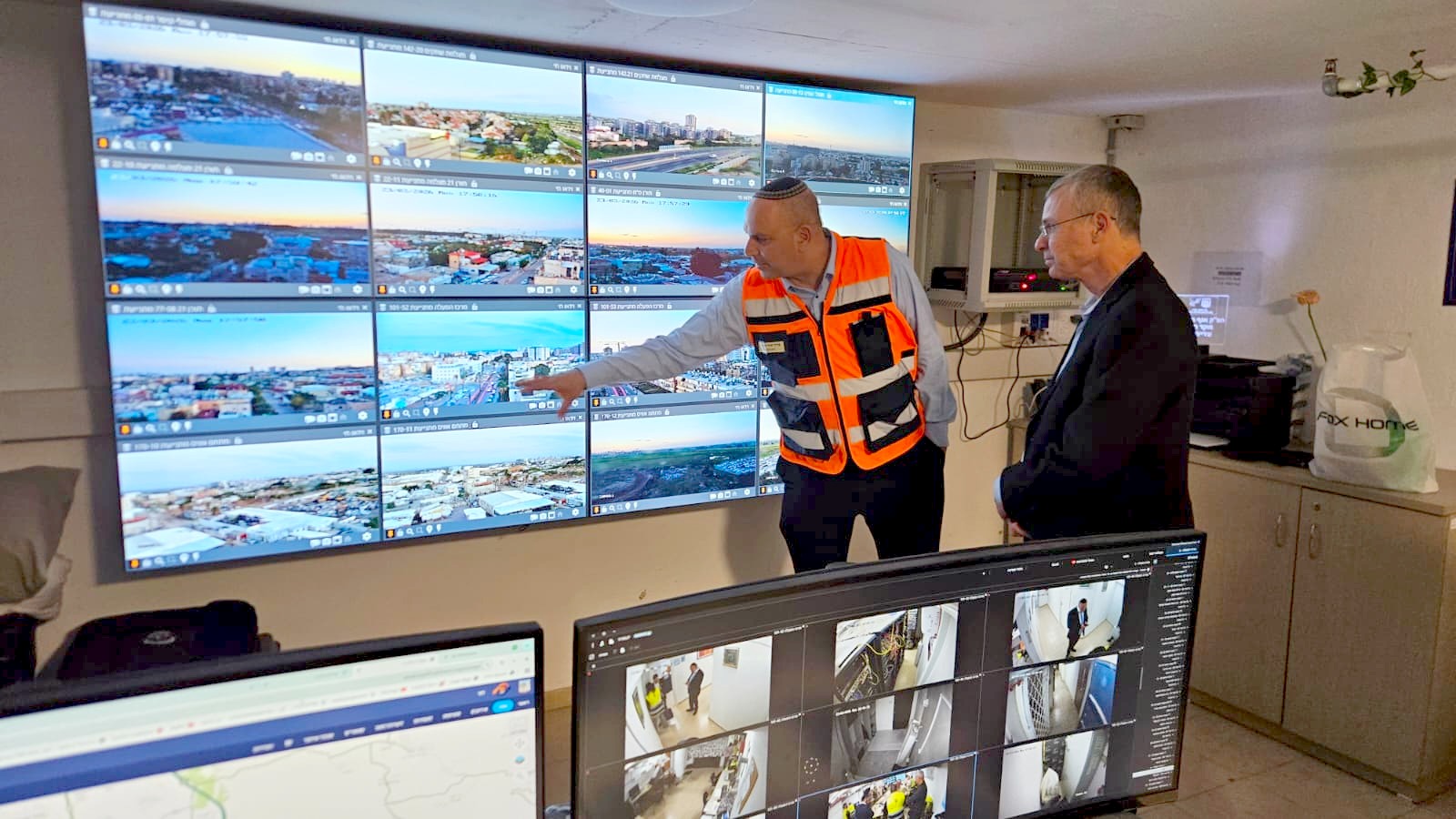 בתמונה: השר לוין מקבל סקירה על המוקד הרואה של עיריית לוד שמפעיל 1500 מצלמות