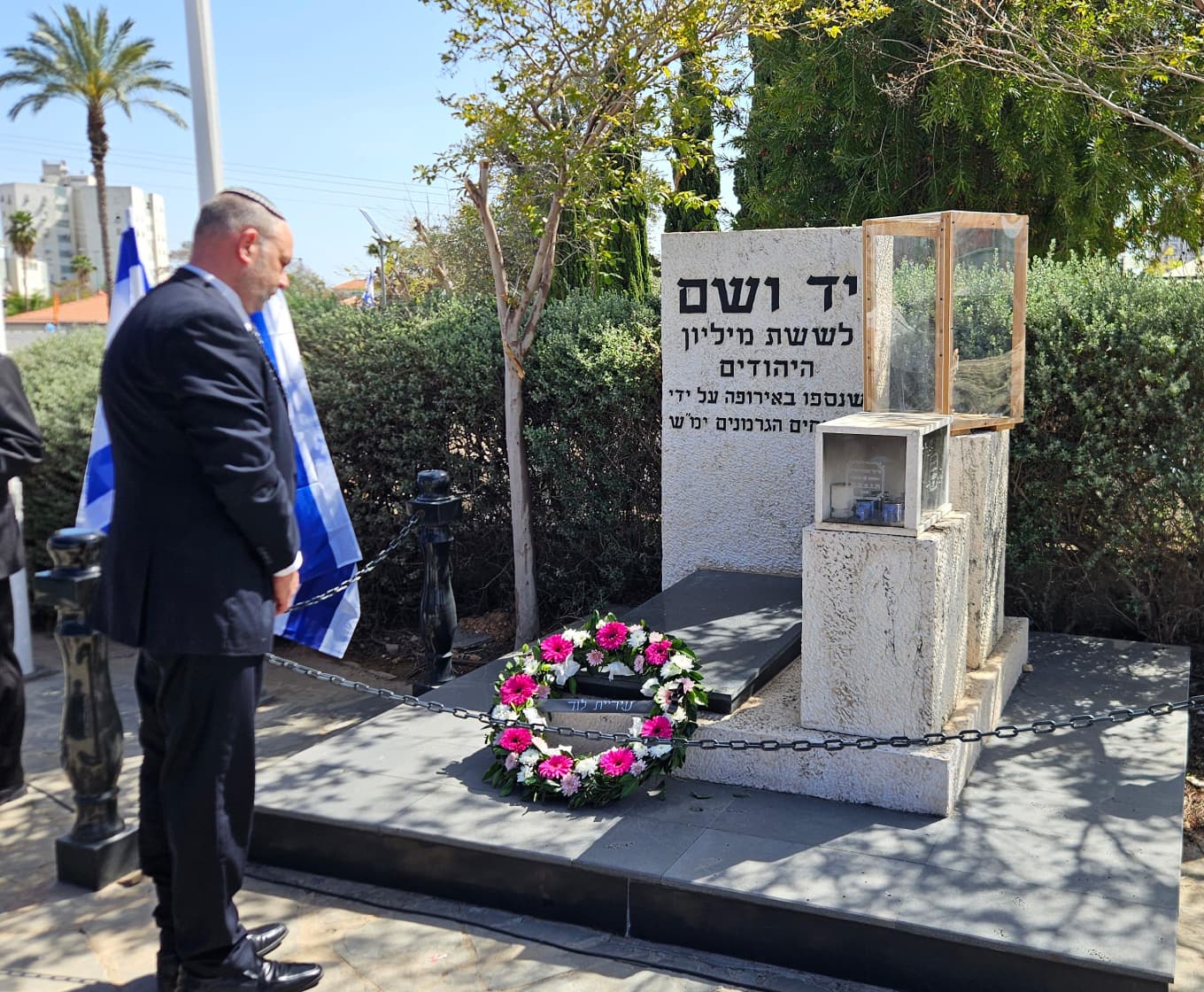 הנחת זר עיריית לוד באנדרטת השואה בבית העלמין ע"י ראש העיר