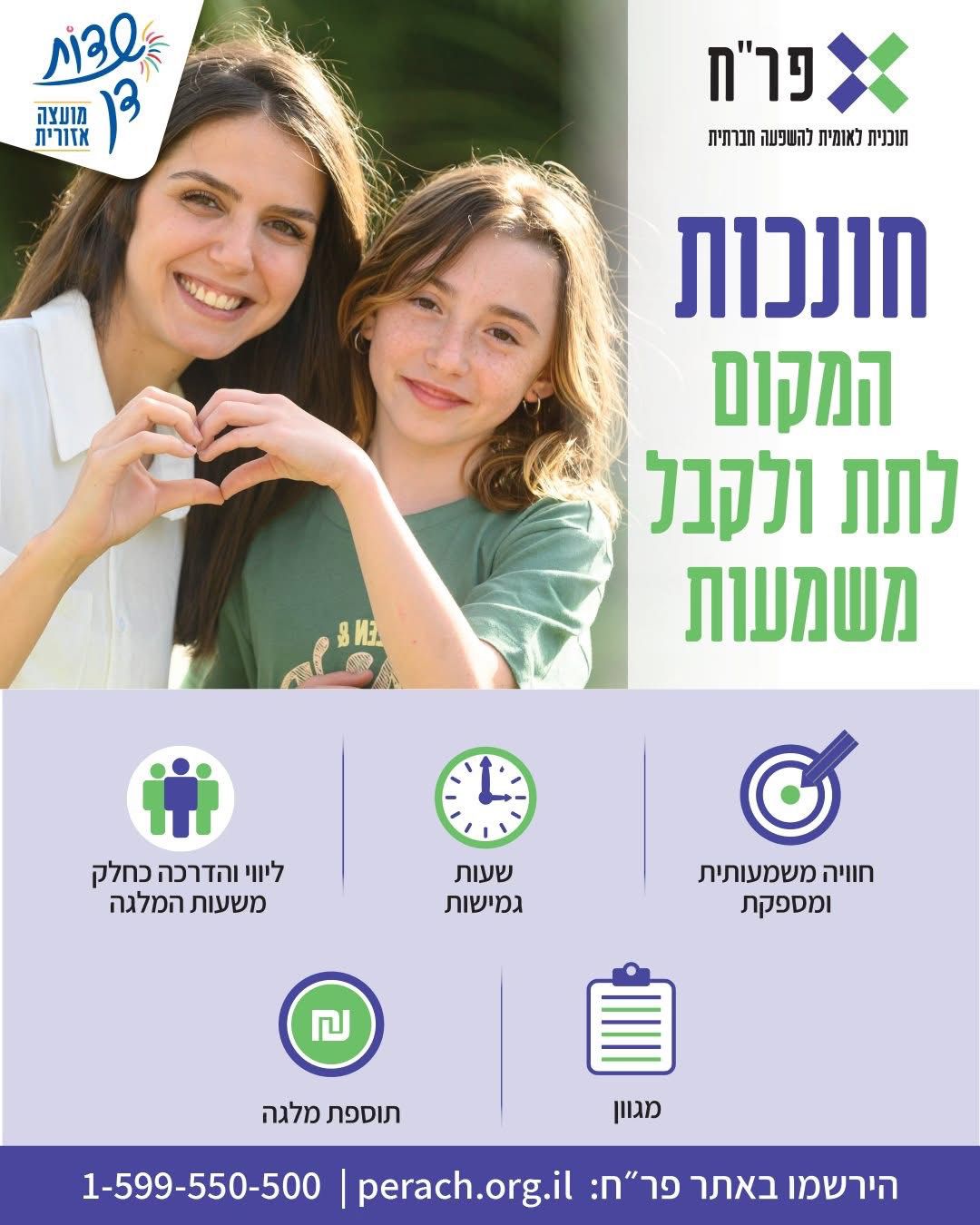 מועצה אזורית שדות דן שמחה לבשר על פתיחת ההרשמה למלגת פר”ח תשפ”ו. הפרויקט המוביל בתחום ההשפעה החברתית בישראל, מזמין אתכם הסטודנטים להצטרף למסע חונכות ייחודי, המשלב תרומה אמיתית לילדים ולנוער עם חוויה אישית משמעותית. במסגרת התוכנית תיהנו מליווי והדרכה מקצועיים, שעות גמישות המתאימות לשגרת הסטודנט, ומלגה כספית שתסייע לכם במהלך הלימודים. מעל הכול – תזכו לקחת חלק בשליחות ערכית שמביאה לשינוי אמיתי בחייהם של חניכים צעירים.