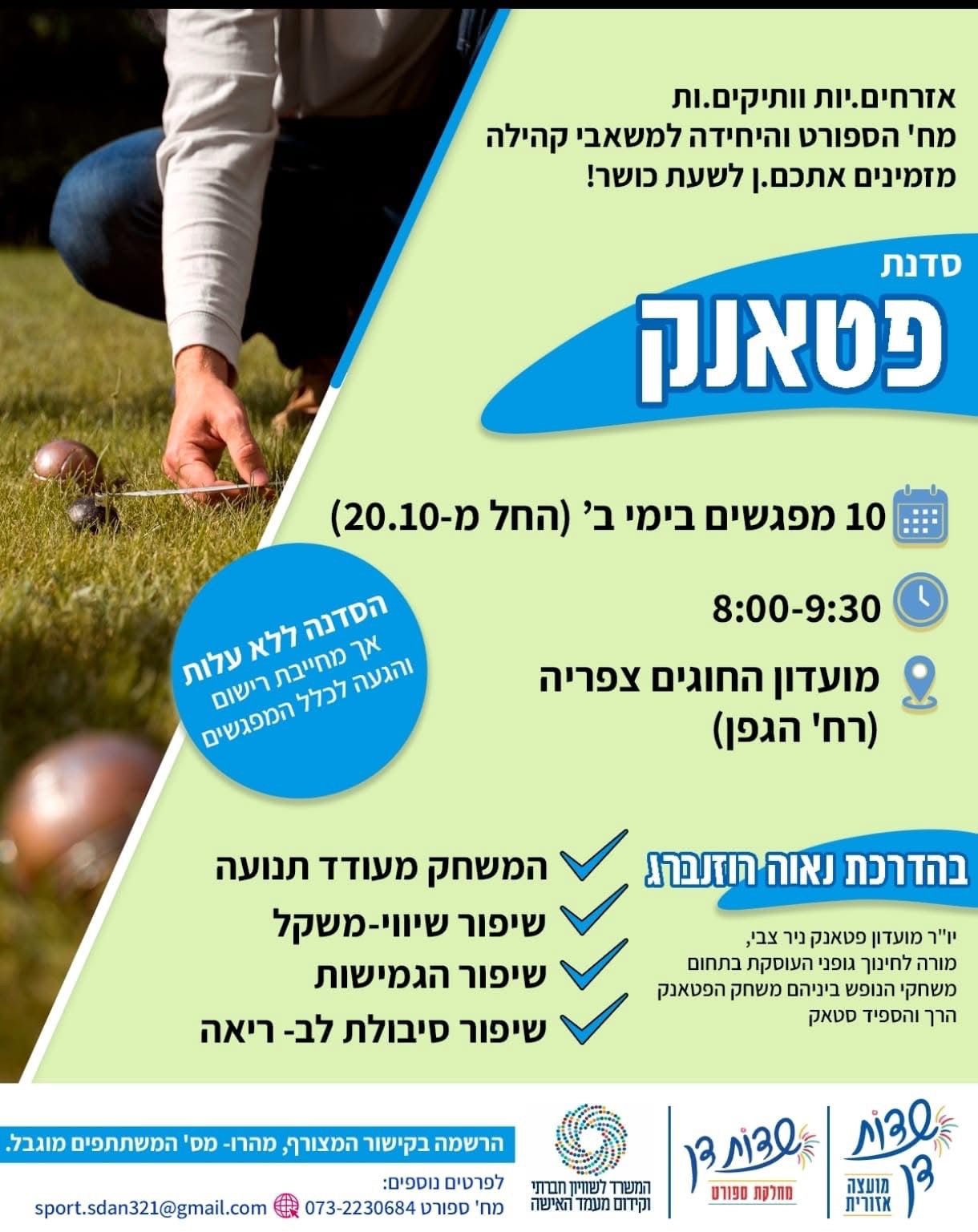 מחלקת הספורט והיחידה למשאבי קהילה במועצה האזורית שדות דן מזמינות את האזרחים הוותיקים להצטרף לסדנת "פטאנק" חווייתית – ללא צורך בניסיון קודם וללא עלות.
