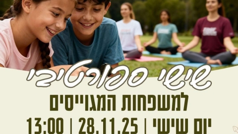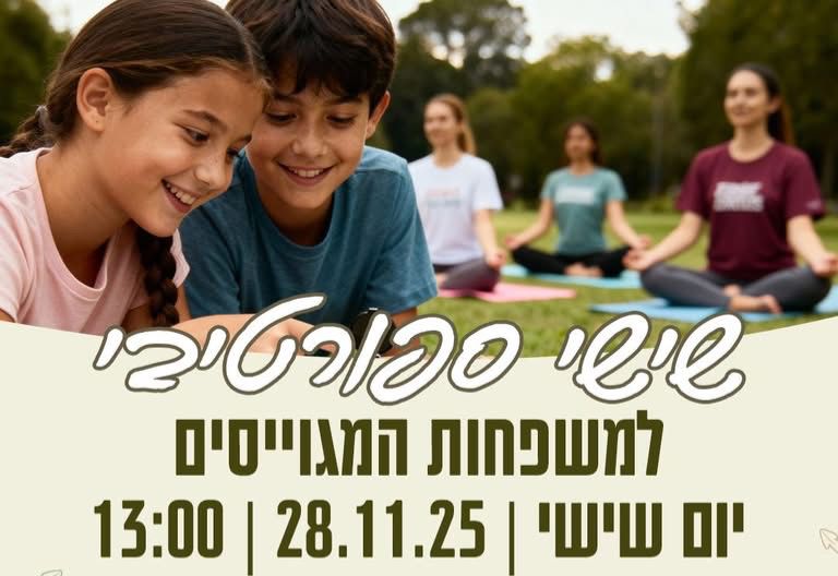 מועצה אזורית שדות דן מזמינה את משפחות המגוייסים ליום שישי ספורטיבי ומלא אנרגיות טובות, שייערך ביום שישי, 28.11.25, בשעה 13:00, ברחבת הדשא של מועדון החוגים בצפריה, רחוב הגפן 53. הפעילות נבנתה במיוחד עבור משפחות המילואים, ומטרתה להעניק רגע של נשימה, חיבור ומרחב נעים של תנועה מהנה. האירוע יכלול ריצת ניווט משותפת עם ילדים מגיל 6 ומעלה, לצד אימון פילאטיס מרגיע ומהנה לנשים, שיתקיים במקביל.